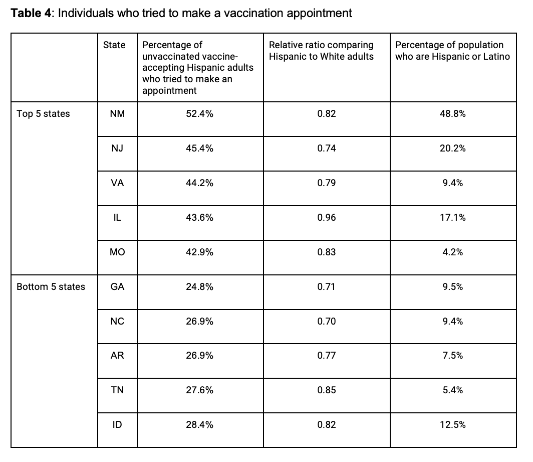 GA stands out because it also has the lowest proportion of Hispanic adults who tried to make an appointment (24.8% compared to the national average of 31.8%), and Hispanic adults were much less likely to try than White adults (0.71×). This suggests that addressing vaccine hesitancy alone will not be sufficient to eliminate disparities in uptake between Hispanic and White adults, and that other approaches such as increasing availability of information about how to get a vaccine may be necessary.